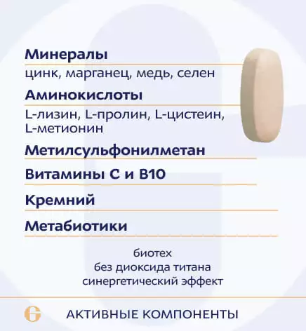 метилсульфонилметан, микрокристаллическая целлюлоза (носитель), витамин С (аскорбил пальмитат), гидроксипропилметилцеллюлоза (носитель), L-цистеин, L-метионин, бамбука экстракт, парааминобензойная кислота, L-лизина гидрохлорид, L-пролин, биомасса гидролизованная сухая «УЛЬТРАЛИЗАТ ПЕПТИДНЫЙ» консорциум штаммов Bifidobacterium longum subsp. Longum ARTB-184, Lactobacillus delbrueckii subsp. bulgaricus ARTB-131, Streptococcus thermophilus ARTB-188, цинка цитрат, кальция карбонат (краситель), кроскарамеллоза (стабилизатор), кальциевая соль стеариновой кислоты (агент антислеживающий), поливинилпирролидон (носитель), полиэтиленгликоль (агент влагоудерживающий), марганца L-аспартат, кремния диоксид (агент антислеживающий), меди L-аспартат, селен (селексен), красители: железа оксид желтый, черный, красный.