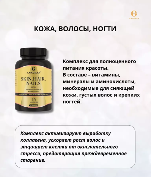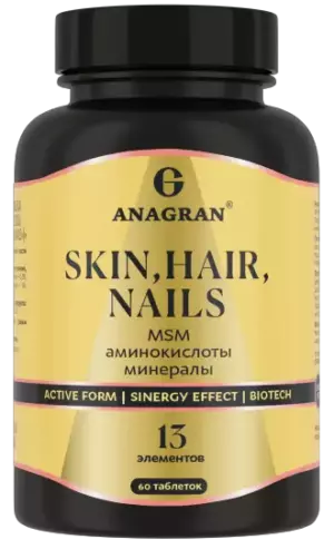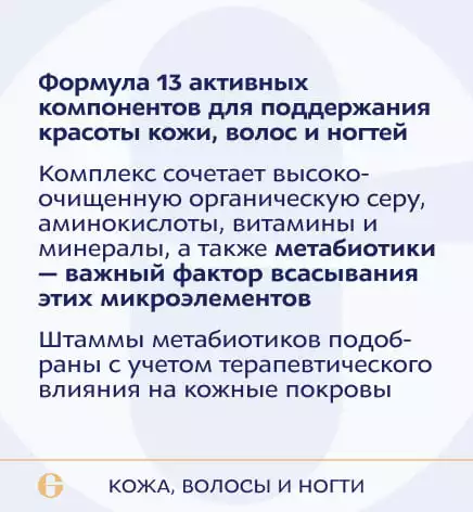 Комплекс из 13 активных компонентов с уникальным сочетанием высокоочищенной органической серы (MSM), аминокислот, минералов и метабиотиков – продуктов биотехнологического производства для поддержания здоровья и красоты кожи, волос, ногтей.