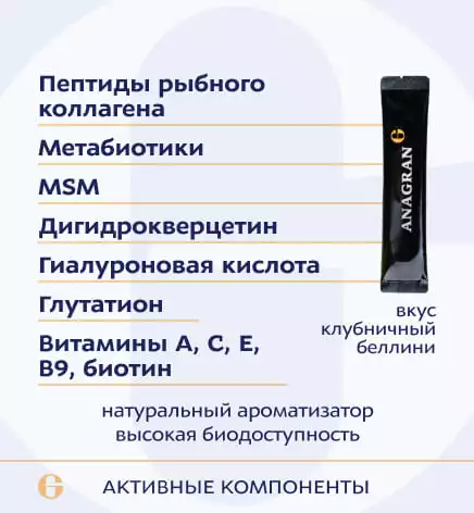 Подробнее состав:пептиды рыбного коллагена, метилсульфонилметан, сухая липосомированная субстанция с дигидрокверцетином (дигидрокверцетин, лецитин), биомассы гидролизованные сухие «УЛЬТРАЛИЗАТ ПЕПТИДНЫЙ» (Bifidobacterium adolescentis ARTB-127, L.delbrueckii subsp.bulgaricus ARTB-131, P. freudenreichii ARTB-137, Streptococcus thermo-philus ARTB-188), сухая липосомированная субстанция с аскорбатом натрия (натрия аскорбат, лецитин), гиалуроновая кислота, глутатион, витамин Е (токоферола ацетат), витамин А (ретинола ацетат), витамин В9 (фолиевая кислота), витамин Н (биотин). Вспомогательные вещества: трегалоза, ароматизаторы натуральные яблоко-клубника, лимонная кислота (регулятор кислотности), сукралоза (подсластитель).