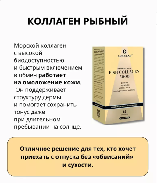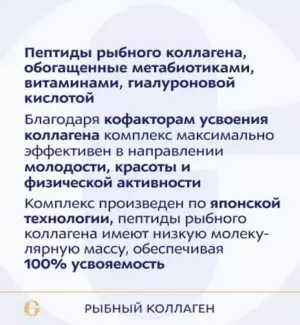 Биоактивный комплекс из 14 активных компонентов на основе пептидов рыбного коллагена – это универсальный молекулярный конструктор тканей человека. Комплекс пептидов рыбного коллагена создан с использованием запатентованных ферментативных производственных процессов для обеспечения оптимального уровня функциональных дипептидов, что приводит к повышению эффективности продукта.