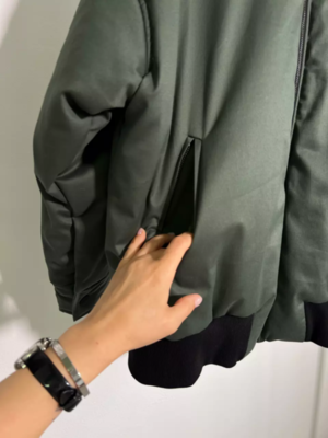 Стильная, объемная, удлиненная куртка в стиле Casual, выполнена из плотной курточной ткани OXFORD, прямого силуэта, на вискозной авторской подкладке. Изделие на молнии. По переду прорезные карманы в рамку на молнии. Спинка с фигурной кокеткой. Низ изделия на плотной притачной планке из отделочной ткани, в которую дополнительно вставлена резинка. Рукав спущенный, комбинированный, длинный. Низ рукава на манжете, по локтевому шву внизу вставлена декоративная молния. На левом рукаве декоративный накладной карман с молнией. Воротник- стойка, выполнен из отделочной ткани.