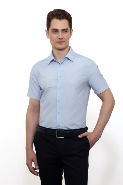 Элегантная мужская сорочка с коротким рукавом приталенного силуэта. Подчёркивает линии фигуры, добавляя образу стройности и уверенности. Идеальный баланс между стилем и комфортом.