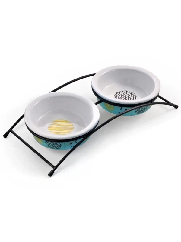 Этот функциональный комплект из двух универсальных круглых мисок на подставке выполнен из керамики высокого качества и отлично подходит для кошек и собак мелких пород. Такие миски идеальны как для воды, так и для корма разной консистенции. Изделие комфортно для питомца и легко моется под струей проточной воды с использованием моющих бытовых средств. А эффектный дизайн стилизованной под ковку подставки позволит ей стать украшением любого интерьера. Цвет: бирюзовый. Размер: d дна - 73мм; d в верхней части - 100мм; высота - 35мм. Размер подставки - 250*110*45мм. Объем 2*0,12л.
