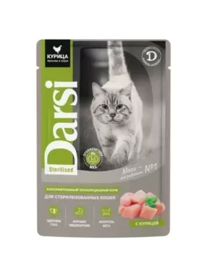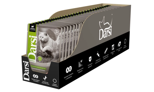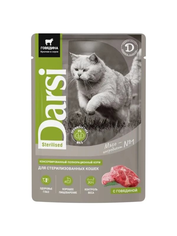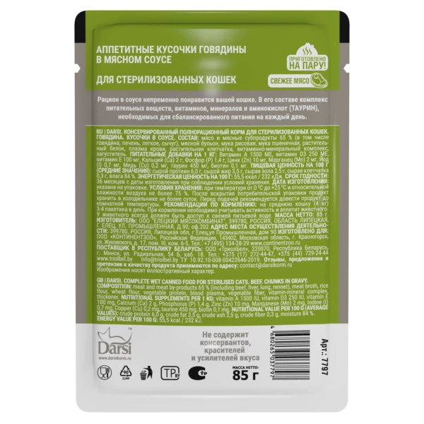 DARSI, Паучи для стерилизованных кошек, Говядина, кусочки в соусе, 85 г, 7797