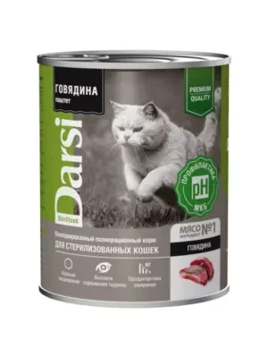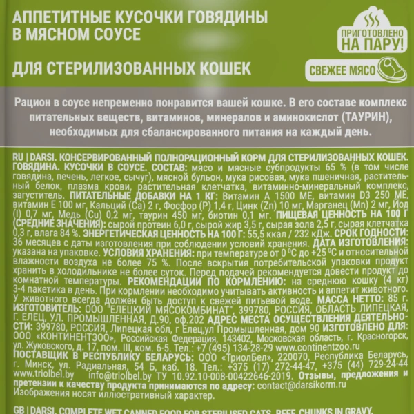 Ингредиенты в составе влажного корма Darsi «Говядина» для стерилизованных кошек: