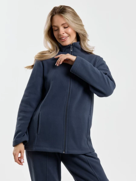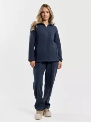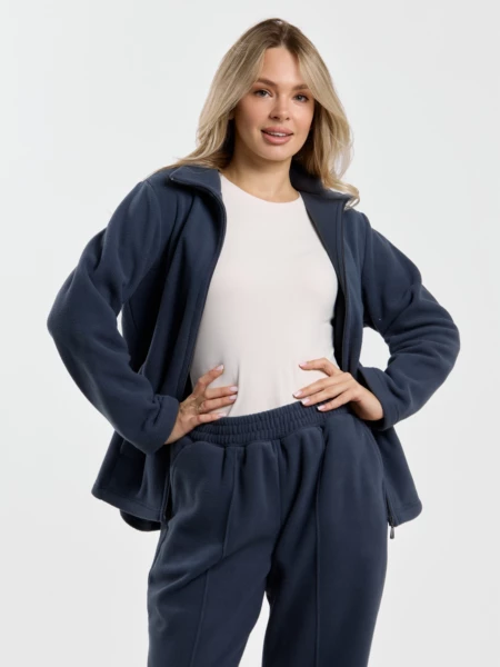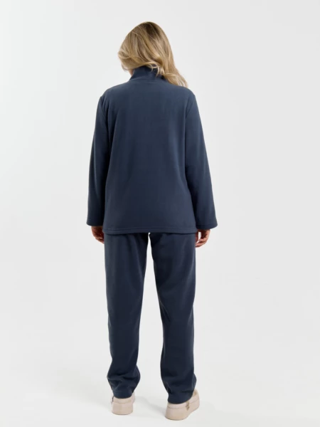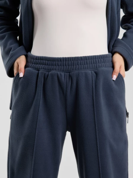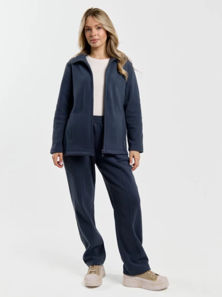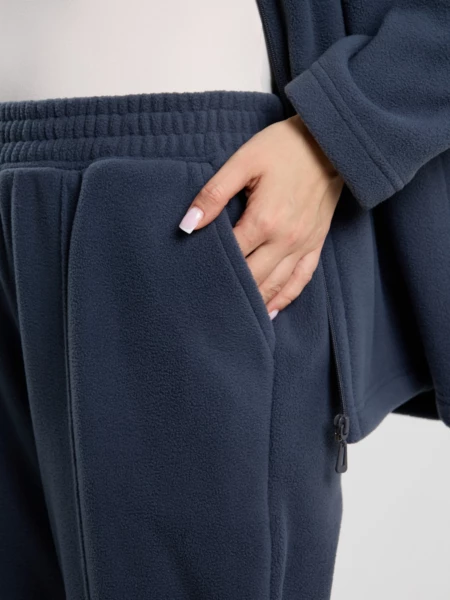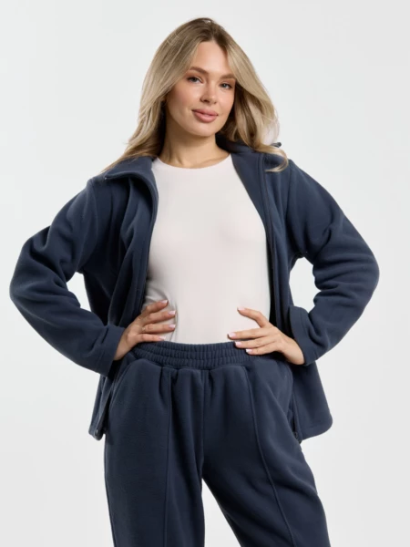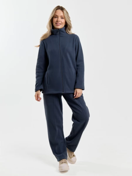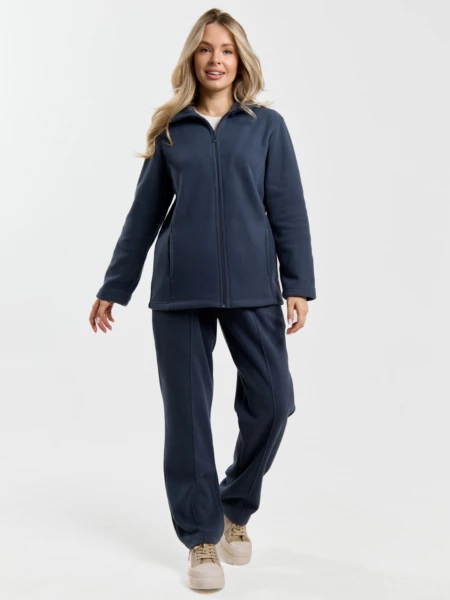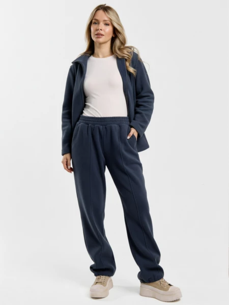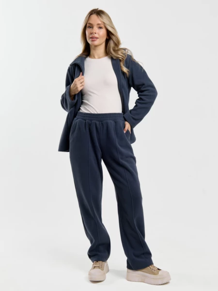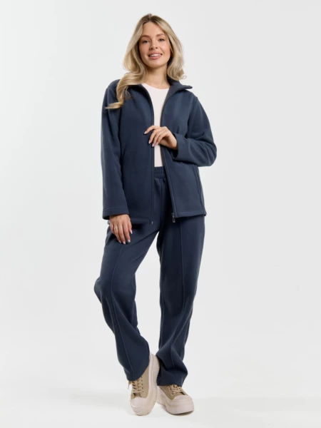 Костюм молодежный из гладкокрашенного трикотажного полотна «флис», Толстовка - полуприлегающего силуэта, с длинными втачными рукавами, воротником «стойка», карманами в рельефных швах, центральной бортовой застежкой на тесьму «молния». Брюки длинные, полуприлегающего силуэта, на притачном поясе с эластичной тесьмой внутри и карманами в боковых швах. Передние половины застрочены поцентральным линиям, низ брюк обработан подгибкой с вложением эластичной тесьмы и регулируется по ширине с помощью фиксаторов.