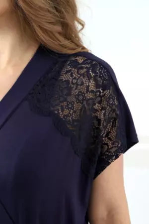 Халат из гладкокрашеного вискозного трикотажного полотна, на запахе, с короткими цельнокроеными рукавами, кружевными кокетками на полочке и притачной планкой по бортам и горловине. Два завязывающихся сзади полупояса втачаны в левый боковой шов и правый шов притачивания планки на уровне линии талии.