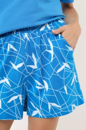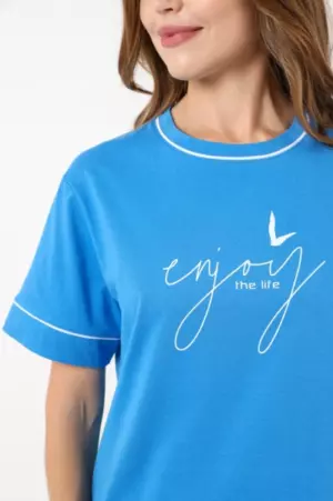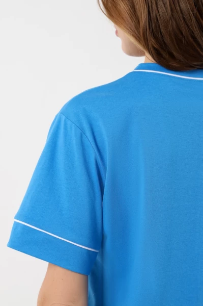 Костюм молодежный из трикотажного полотна «кулирка» в комбинации двух видов полотен: гладкокрашеной и с набивным рисунком, состоящий из футболки и брюк. Футболка – из полотна с набивным рисунком, свободного покроя, с короткими втачными рукавами, горловиной овальной формы, обработанной двойной притачной бейкой из контрастного материала. На полочке принт, выполненный в технике «шелкографии», рукава с отделочными манжетами и кантом.Шорты – из полотна с набивным рисунком, свободные, с карманами в боковых швах, на притачном поясе с эластичной тесьмой внутри. Костюм женский