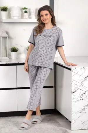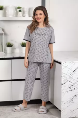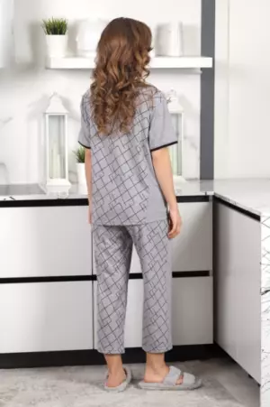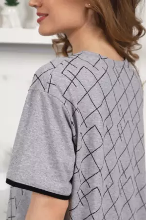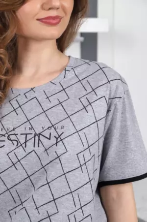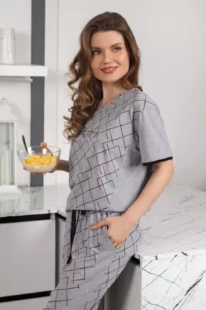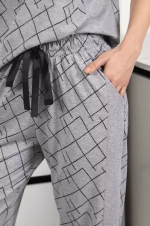 Костюм молодежный из трикотажного полотна «кулирка-меланж» в комбинации гладкокрашенного полотна и полотна с набивным рисунком, состоящий из футболки и брюк. Футболка – из полотна с набивным рисунком, с короткими втачными рукавами, слегка удлиненными плечевыми швами, горловиной овальной формы, треугольными вставками в боковых швах и принтом в центре переда, выполненным методом «шелкографии». Рукава и треугольные вставки выполнены из гладкокрашеного полотна. Горловина обработана притачной бейкой из основного материала, нижние срезы рукавов - из отделочного черного цвета. Брюки – из полотна с набивным рисунком и декоративными вставками в боковых швах из гладкокрашеного полотна, укороченные, на притачном поясе с эластичной тесьмой внутри и карманами в боковых швах. Пояс – с декоративным шнурком из репсовой ленты черного цвета, вставленный через две обметанные петли спереди. Костюм женский