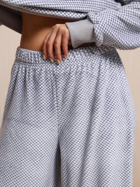 Брюки – из набивного полотна длинные, прямые, с эластичной тесьмой по линии талии. Костюм женский