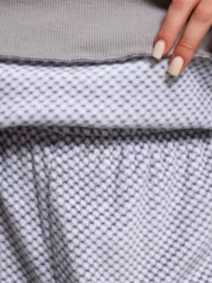 Планка горловины, манжеты рукавов и притачной пояс из однотонного трикотажного полотна «кашкорсе».