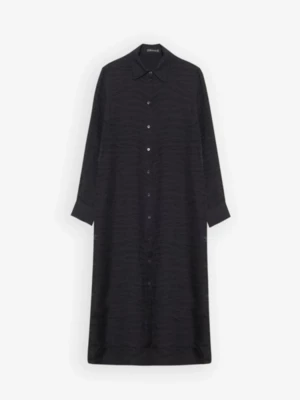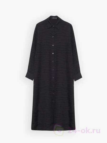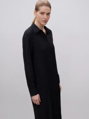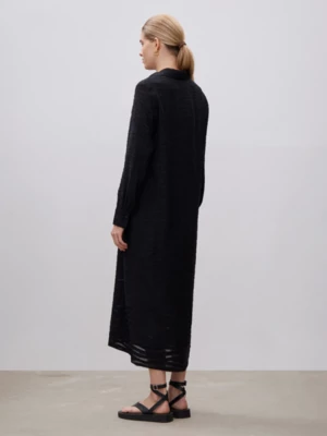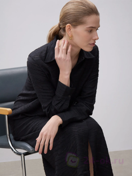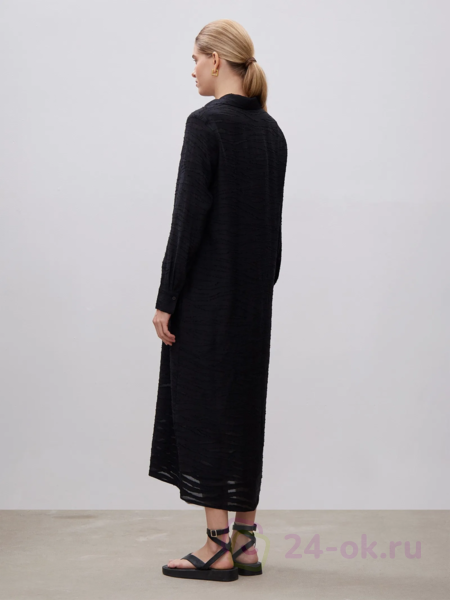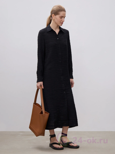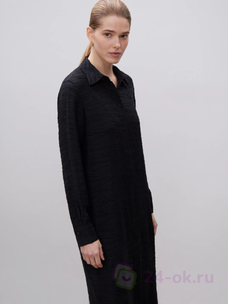 Оригинальное чёрное платье-рубашка с необычной фактурой из вискозы. Модель А-силуэта имеет модную длину миди. Выполнено на комфортной к телу подкладке. Платье станет органичной частью повседневного летнего и демисезонного гардероба. Длина: 130 см. Цвет: черный Силуэт: а-силуэт Сезон: мульти Рукав: длинный Застёжка: пуговицы Подкладка: 100% вискоза Рост модели: 175-178 См 100% вискоза