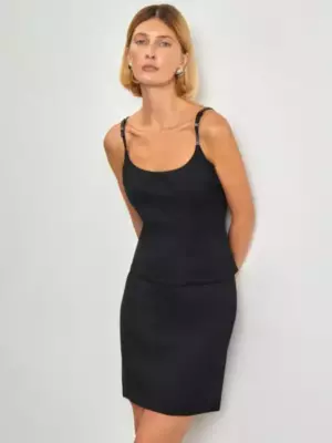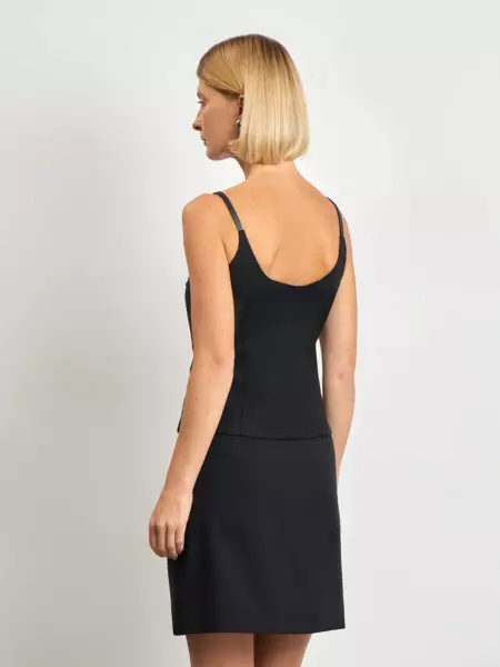 Элегантный топ корсетного кроя с намёком на баску и скруглённым вырезом каре станет основой множества образов. Облегающую модель на тонких бретелях удобно носить под жакет. Бретели можно регулировать. Материал под кожу делает их изюминкой образа. Топ почти наполовину состоит из натуральной шерсти и выполнен на приятной к телу подкладке из хлопка: это комфортно и практично. Завершить образы с топом можно юбкой и жакетом из комплекта. Длина: 30 см. Цвет: черный Силуэт: приталенный Сезон: демисезон Застёжка: молния Подкладка: 100% хлопок Рост модели: 175-178 См 55% полиэстер, 45% шерсть