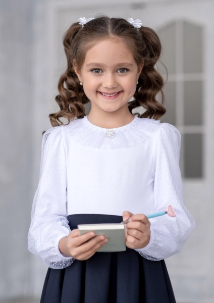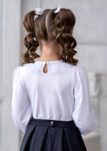 146р. 1343 руб._x000D_ 140р. 1304 руб._x000D_ 134р. 1266 руб._x000D_ 128р. 1230 руб._x000D_ 122р. 1195 руб._x000D_ Модель блузки для младшей возрастной группы. Блузка из трикотажного полотна в комбинации с отделкой из сетки-мушки. Застёжка на спине на воздушную петлю-пуговицу, с разрезом формы-капля. Воротник плосколежащий из сетки-мушки с двухъярусной оборкой в сборку. Рукав двухслойный, верхний слой из секи-мушки со сборкой по окату и низу. Горловина и низ рукава зафиксированы окантовкой из основной ткани. Горловина оформлена кружевом ромашка, по центру пристёгивается брошь. Длина по спинке: 122-43,5 см, 128-45 см, 134-46,5 см, 140-48 см, 146-49,5 см. Состав: 100% вискоза, отделка 100% полиэстер