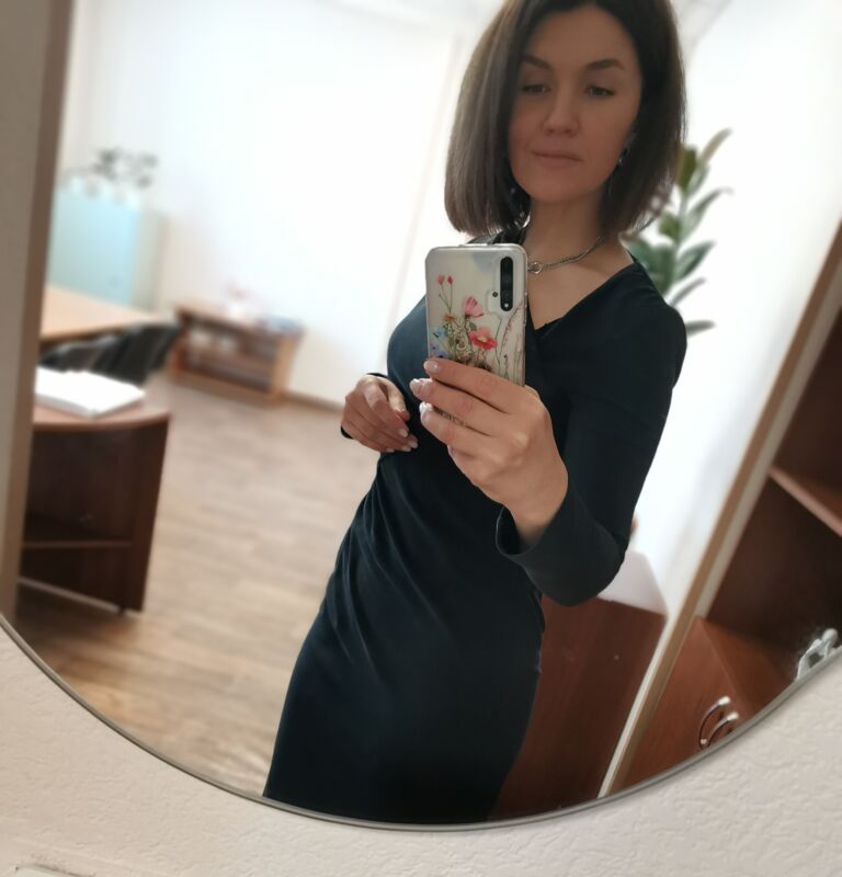 Платье прилегающего силуэта, из трикотажной ткани, длиной ниже линии колена, с ассиметричной формой горловины, перед с фигурным подрезом и драпировкой от подреза , спинка с вытачками по талии, левый боковой шов заканчивается разрезом. Рукава одношовные, длинные, с отверстием для пальца.