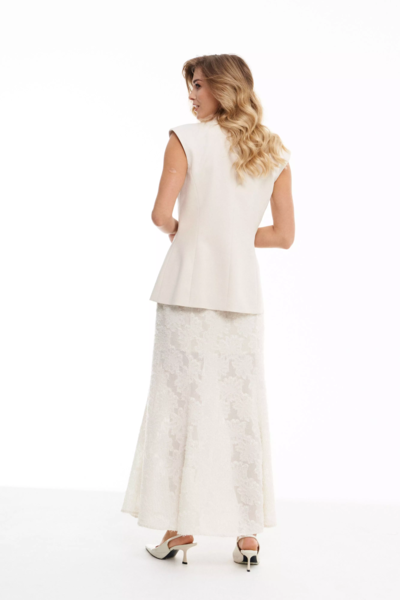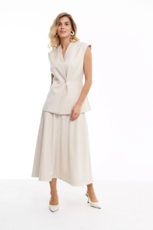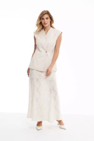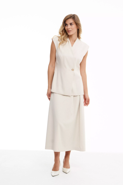 Жилет полуприлегающего силуэта с застежкой на пуговицу и потайную кнопку.