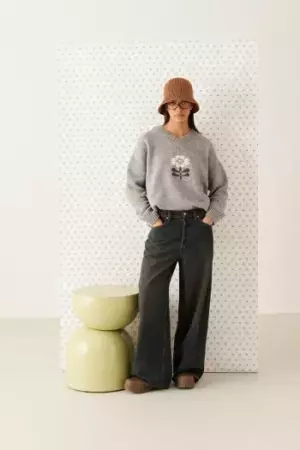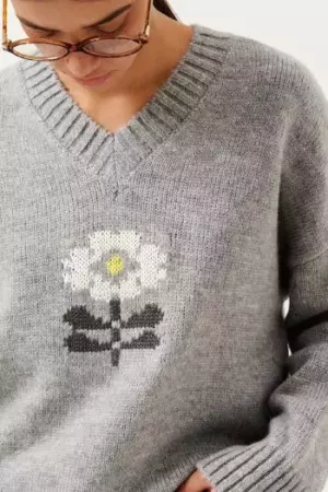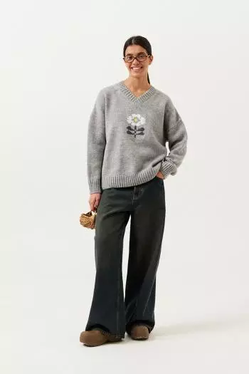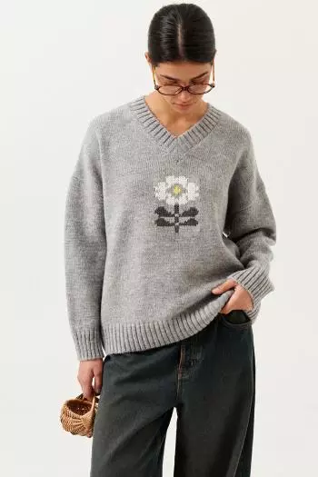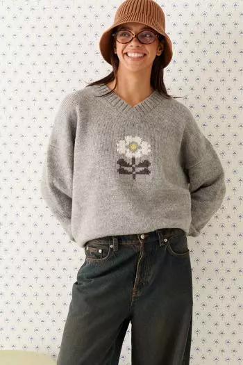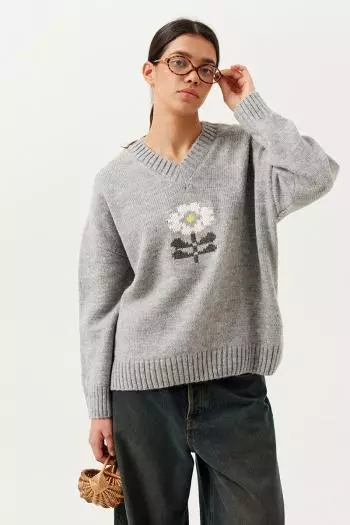 Модель свободного кроя, со спущенной линией плеча и удлиненным рукавом. V-образный вырез горловины визуально удлиняет шею и делает силуэт стройнее. По центру джемпера расположена ромашка.
