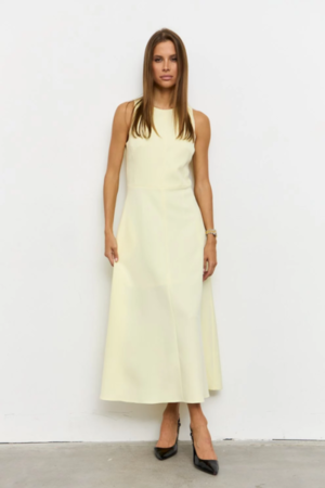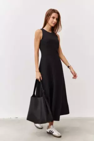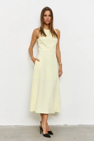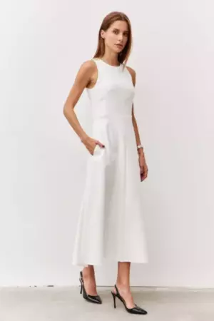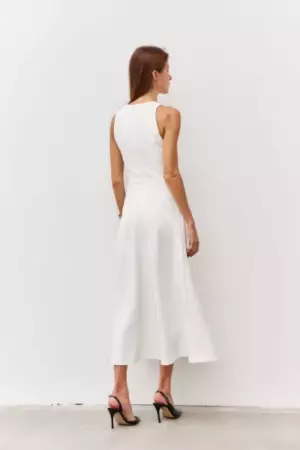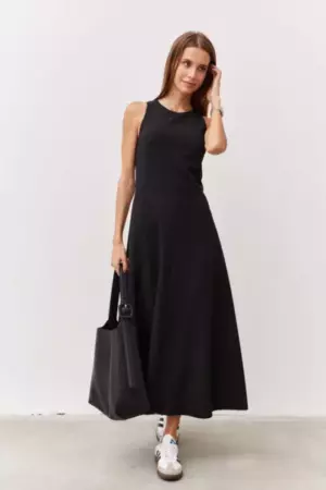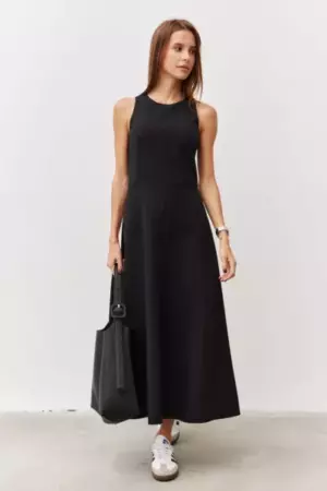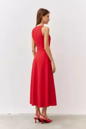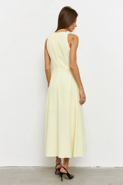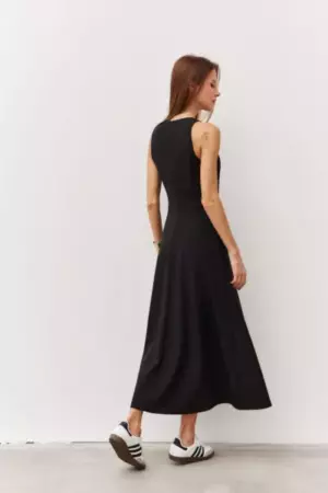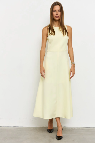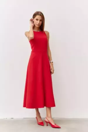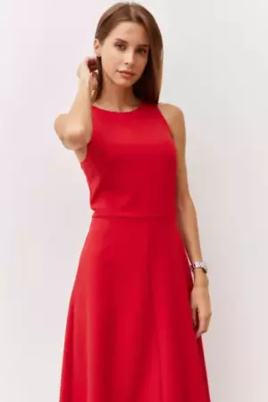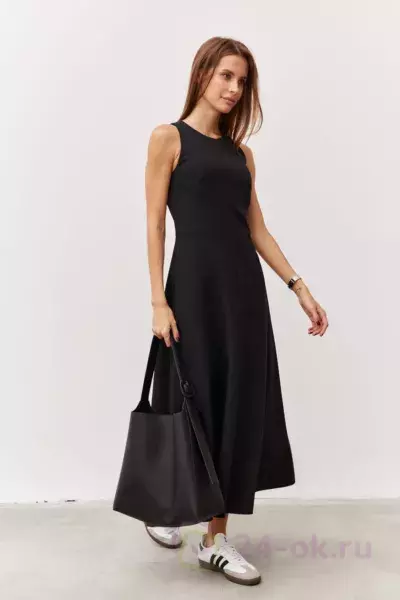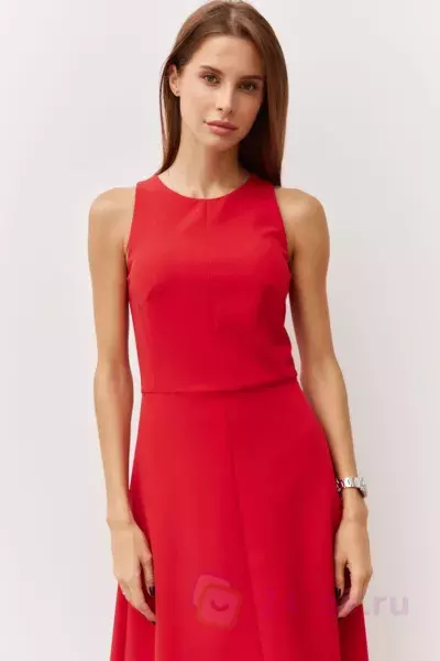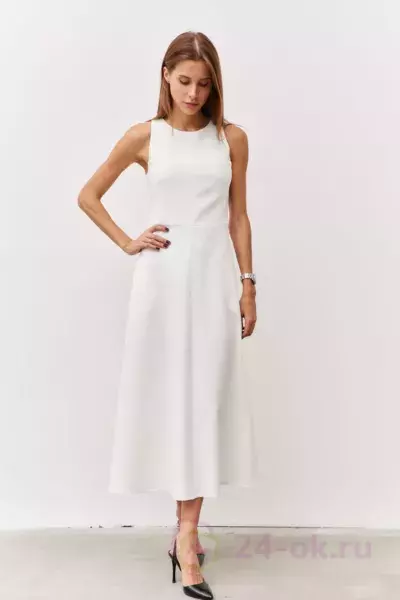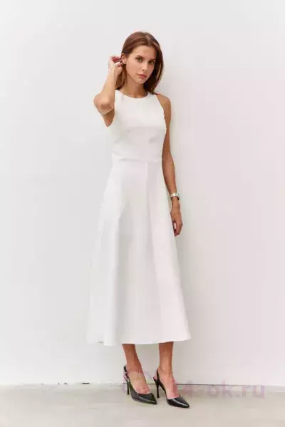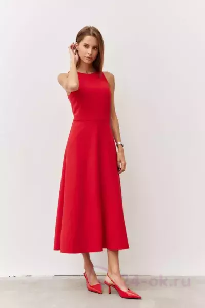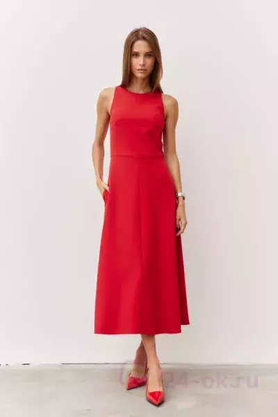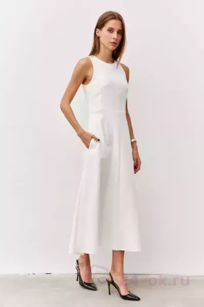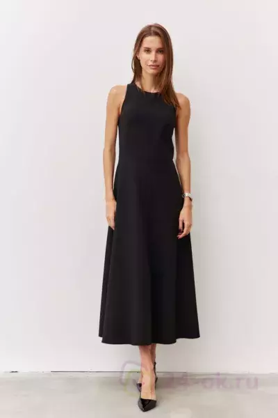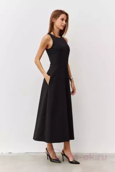 Платье прилегающего силуэта, отрезное по линии талии с юбкой А-силуэта. Изделие выполнено из гладкой плательной ткани на подкладке. В боковых швах обработанны карманы. Застежка в среднем шве спинки на потайную молнию. Длина изделия по среднему шву спинки 130 см.
