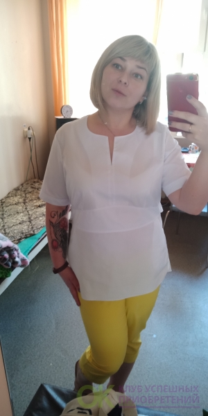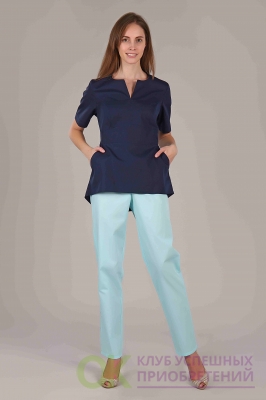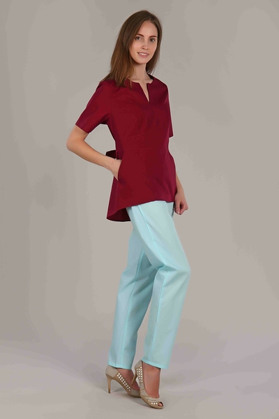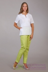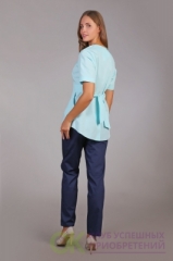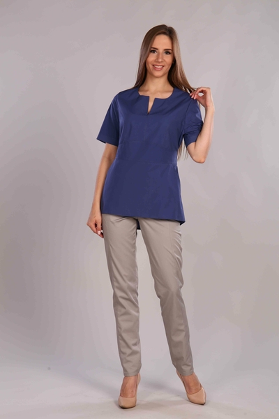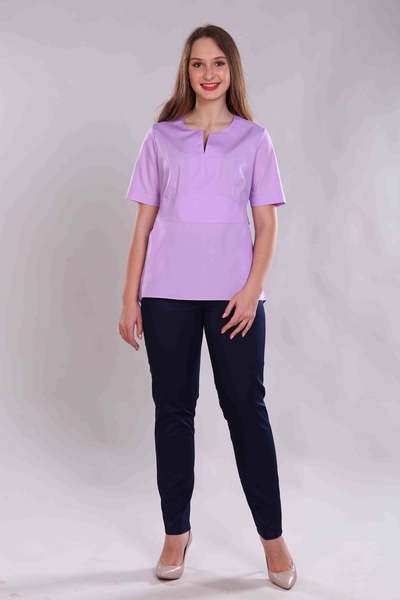 Блуза медицинская с коротким рукавом, приталенного силуэта. Без воротника, горловина-фигурная с разрезом впереди. На полочке фигурный втачной пояс, на спинке пояс завязывающийся он позволяет регулировать прилегание блузы по талии. Имеются два боковых кармана. Размеры: 40-54