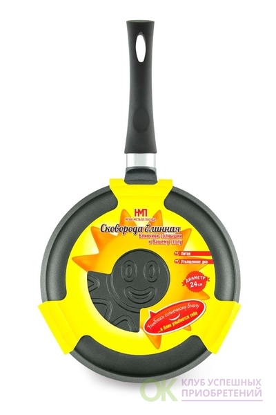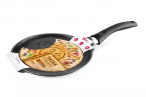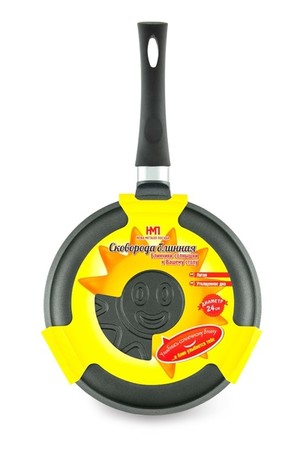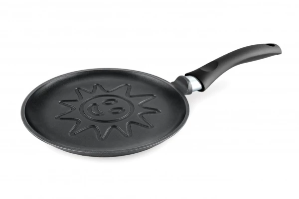 Блинная сковорода имеет низкий борт и удобную ручку, благодаря чему легко переворачивать и снимать блины. Утолщенное дно обеспечивает особые термоаккумулирующие свойства: блин равномерно пропекается по всей толщине и красиво румянится с обеих сторон. Благодаря антипригарному покрытию блины всегда легко снимаются со сковороды и не пригорают, даже при выпекании без использования масла.