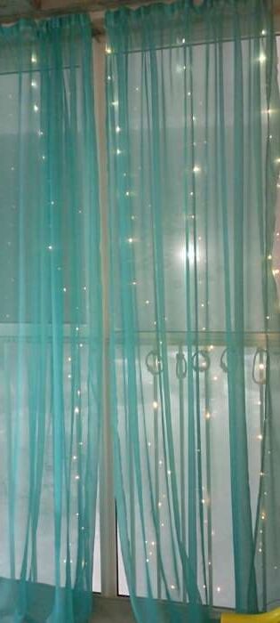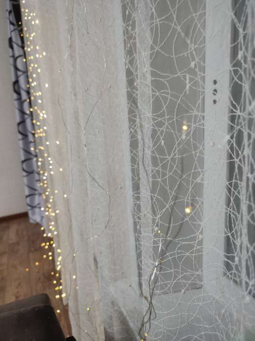 - Неплохая гирлянда за свои деньги. Конечно фонарики оооочень маленькие, такое всё хрупкое, надо быть очень аккуратным, когда разматываешь. Расстояние между нитями 30см. Т.е. на всю длинну получается 10 нитей. Хорошо, что взяли 2 штуки. Т.к. с одной очень мало света. Надо отметить удобство размещения на шторе за счёт уже готовых крючков.