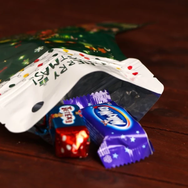 * Новогодний дизайн: Яркие праздничные рисунки заменяют традиционную обертку. Не требует дополнительного украшения — сам становится частью подарка.