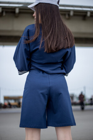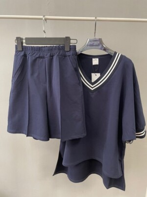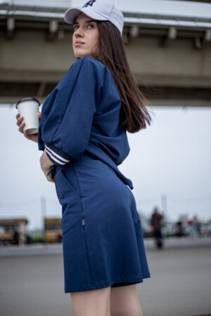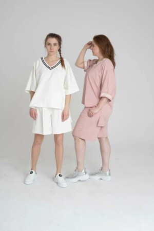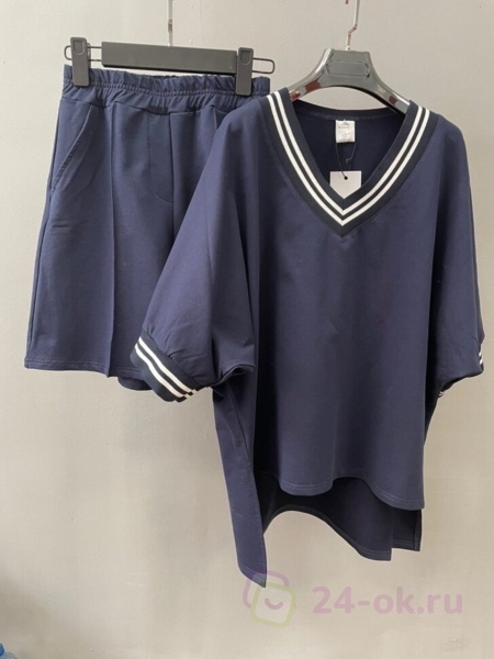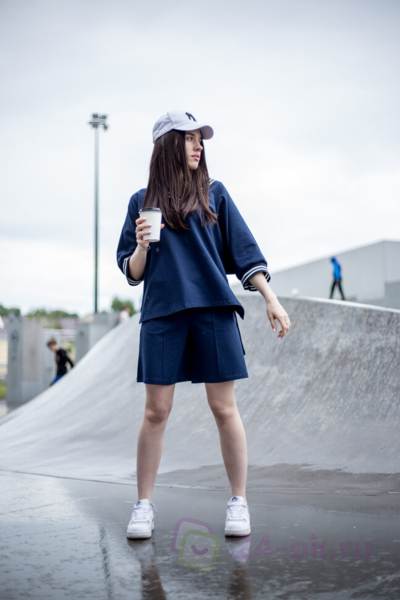 Костюм состоит из оверсайз футболки широкого кроя и шортов со стрелками.