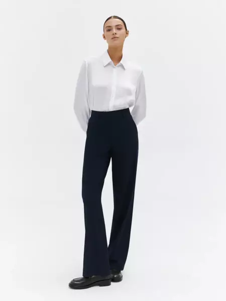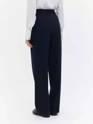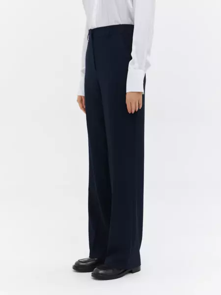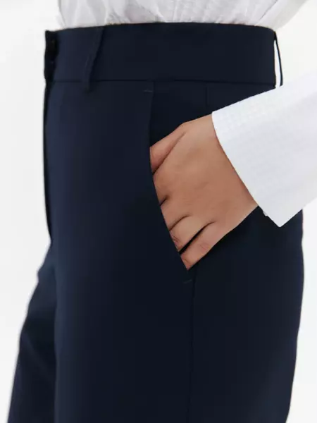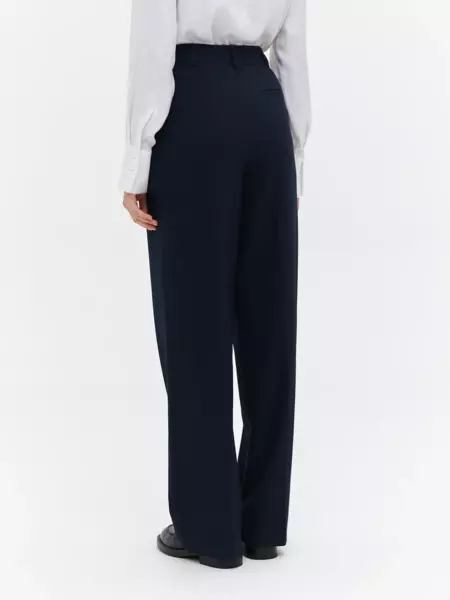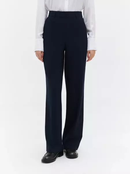 63% полиэстер, 34% вискоза, 3% эластан Классические брюки прямого кроя в темно-синем цвете. Универсальная модель с легкостью впишется в любой гардероб и станет основой для большого количества деловых образов. Благодаря высокой посадке создается элегантный силуэт с акцентом на талии. По всей длине изделия проходят заутюженные стрелки, спереди имеются вместительные карманы. Застегиваются брюки на потайные пуговицы и молнию, а по периметру пояса расположены шлевки для ремня. - высокая посадка - стрелки - шлевки на поясе - полная длина - декоративный задний карман - функциональные передние карманы - потайные пуговицы и молния Классические брюки прямого кроя в темно-синем цвете. Универсальная модель с легкостью впишется в любой гардероб и станет основой для большого количества деловых образов. Благодаря высокой посадке создается элегантный силуэт с акцентом на талии. По всей длине изделия проходят заутюженные стрелки, спереди имеются вместительные карманы. Застегиваются брюки на потайные пуговицы и молнию, а по периметру пояса расположены шлевки для ремня. - высокая посадка - стрелки - шлевки на поясе - полная длина - декоративный задний карман - функциональные передние карманы - потайные пуговицы и молния