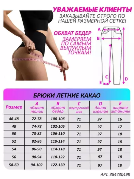 Страна прозводитель РоссияБрак возможна мельнькая зацепка, незначительное пыльное пятнышко, пропуск по шву. Дают усадку после стирки на 1 размер по бёдрам и по длине на 4 смБрюки Амина УЦЕНКА по низким ценам.Состав: хлопок, спандексСезон: Лето