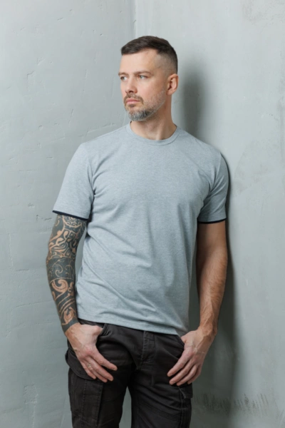 - Однотонная спортивная футболка с короткими втачными рукавами представляет собой незаменимый элемент повседневной одежды для мужчин. В качестве элемента декора модели использован кант контрастного цвета