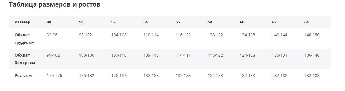 | Размер | 48 | 50 | 52 | 54 | 56 | 58 | 60 | 62 | 64 |