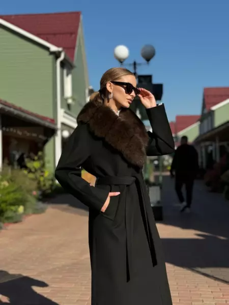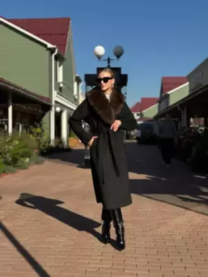 Халатного типа базовая модель, рукав ластовица, на кнопках,высокая шлица, пояс в комплекте. Мех натуральный песец (длинная шалька).