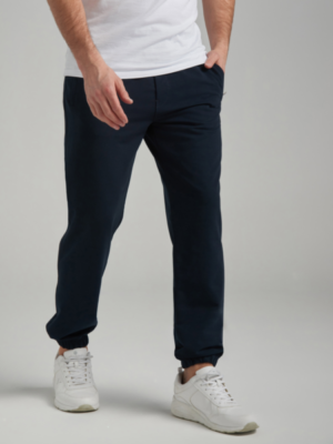 Брюки мужские прямого силуэта из плотного и мягкого хлопкового трикотажного полотна с изнаночным начесом. Карманы с планками, застегиваются на молнии. Под левым карманом настрочен шеврон с фирменным логотипом. Пояс с широкой резинкой, по талии дополнительно регулируется шнурком.