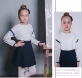 Материал: 95% хлопок,5% эластан Трикотажная блуза для девочек, с рукавом ¾ и спущенной линией плеч. Отделка из синего трикотажного материала на манжетах и по окату добавляет яркости. Сборка по окату и низу рукава придаёт красивый объём.