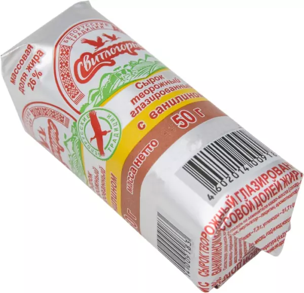 Сырок творожный Свитлогорье в своей основе имеет натуральный творог, произведенный, в свою очередь, из качественного цельного молока. В составе сырков не присутствует никакого растительного жира или других бесполезных, а порой даже вредных для здоровья добавок (консервантов, красителей и так далее). Под маркой Свитлогорье сырки глазированные творожные можно найти на любой вкус и цвет – с ванилином, вареной сгущенкой, какао и другими вкусными и натуральными добавками. Для детей творожный сырок – отличный гостинец. Он поднимет им настроение, добавит бодрости и насытит юный, растущий организм.