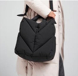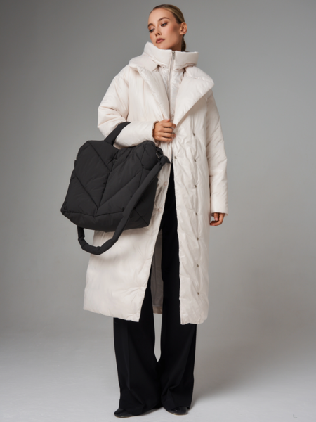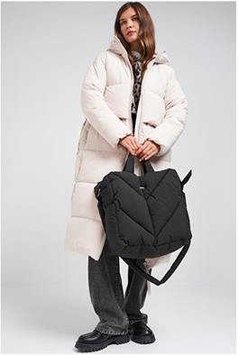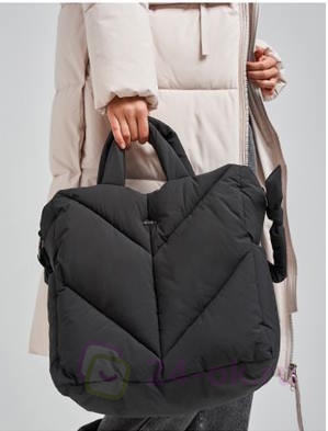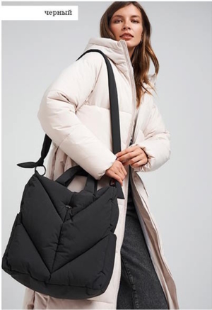 Сумка шоппер на Био пухе Застегивается на магнитную кнопку. Внутри изделия есть карман на молнии. По бокам у сумки есть два удобных кармана. Ручка на плечо крепится узлами к съемным металлическим кольцам. Выполнена из плащевой матовой ткани черного цвета с водоотталкивающей пропиткой.