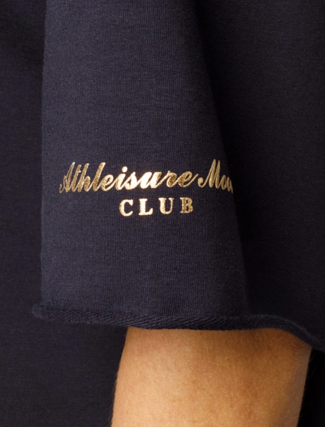 Перевод принта: Athleisure mood club - клуб любителей спортивного стиля. Футболка свободного кроя со спущенным плечом выполнена из футера двухнитки с эластаном. Лаконичный принт нанесен фактурной краской и золотой фольгой. Эластичный материал гарантирует комфорт и формоустойчивость. Сочетается в костюме с брюками D44.138, D44.139 и шортами D48.008. Изделие дополнено металлическим логотипом бренда.