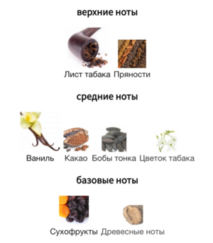 Ноты: Табак, Специи, Какао, Ваниль, Душистый табак,Бобы Тонка, Сухофрукты, Древесные ноты.