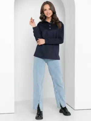 Свободный трикотажный джемпер поло с длинным рукавом- удобная и стильная одежда на все сезоны. По горловине пришит воротничок на стойке, спереди сделана планка с пуговичками. Рукав втачной, немного спущен, внизу на манжете. По боковым швам снизу сделаны разрезы