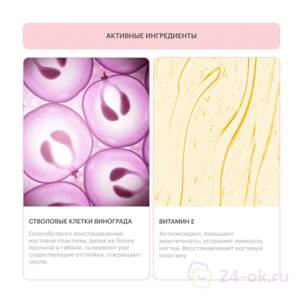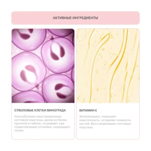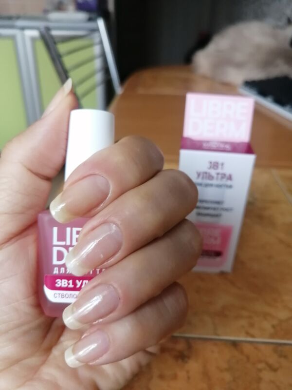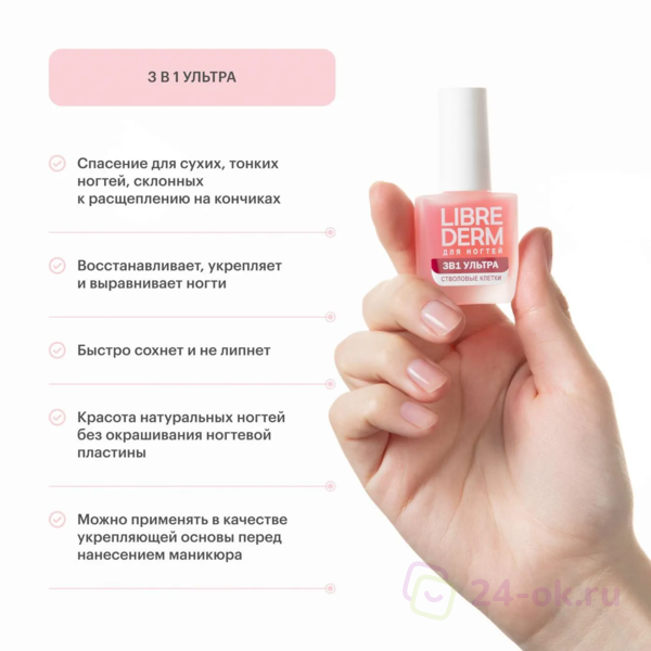 LIBREDERM / Либридерм СТВОЛОВЫЕ КЛЕТКИ ВИНОГРАДА Лак 3 в 1 ультра укрепляет и выравнивает ногтевую пластину, стимулирует рост ногтей, создает защитный слой на поверхности ногтя, закрепляет декоративное покрытие. Предназначен при утончении и расслоении ногтевой пластины, при медленном росте ногтей, при появлении трещинок и бороздков на ногтевой пластине. Стволовые клетки винограда делает ногтевую пластину более прочной и гибкой, способной выдерживать давление без сколов. Витамин Е - антиоксидант, устраняет ломкость ногтей. Восстанавливает ногтевую пластину. Прозрачный лак с легким розовым оттенком, быстро сохнет и не липнет. На ногтях создает естественный эффект, без окрашивания ногтевой пластины. Создает стойкое блестящее покрытие благодаря двойному комплексу смол.