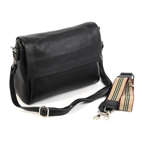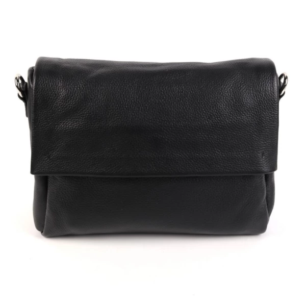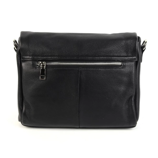 Женская сумка из натуральной кожи черного цвета. Закрывается на клапан и на молнию. Под клапаном есть карман с магнитной кнопкой. Внутри отделение, разделенное карманом на молнии по середине и боковые кармашки, один на молнии и один открытых. Снаружи, на задней стенке карман на молнии. Сумка имеет кожаный наплечный ремень и текстильный.