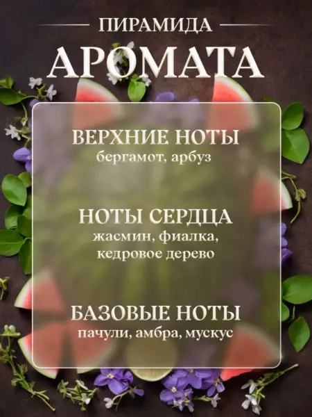 Звучание аромата открывают приятные фруктовые ноты. Благородное цитрусовое звучание бергамота с легким оттенком восточной пряности играет с соблазнительными ягодно-фруктовыми нотами летнего арбуза… Разве можно устоять перед столь откровенными мотивами?
