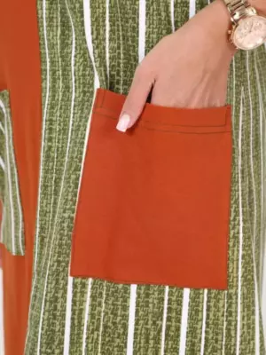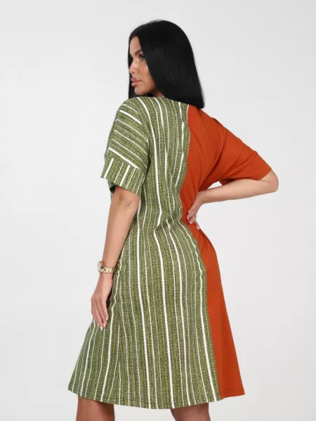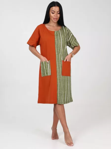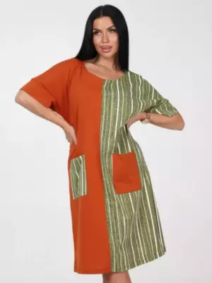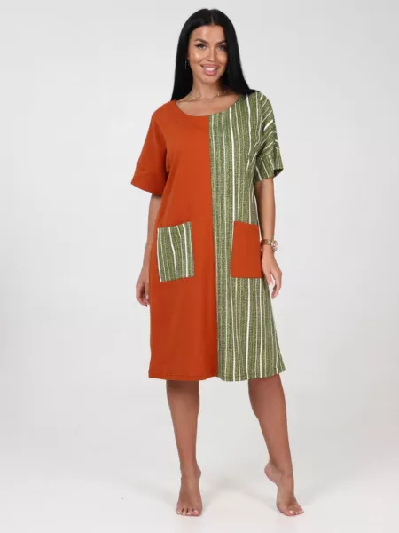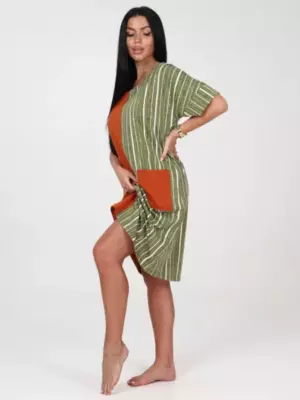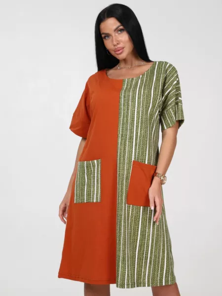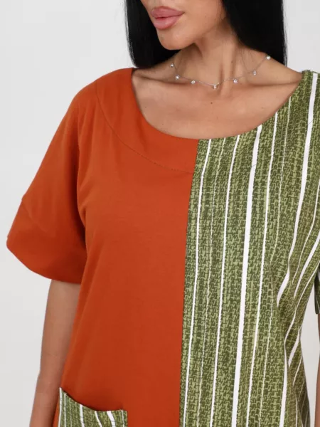 Туника выполнена из полотна "кулирка" двух контрастных расцветок. Модный в этом сезоне тренд, который можно назвать «цвет пополам», изделие визуально делится на половинки, выполненные, как правило, из одного материала, но в разных цветах. Туника свободного покроя со спущенным плечом, на каждой передней половине настрочной карман контрастного цвета._x000D_