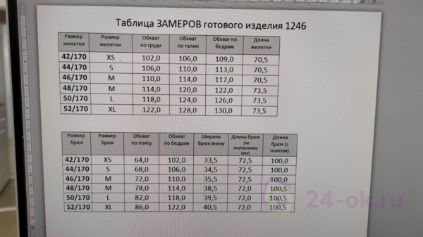Костюм из хорошей, в меру плотной ткани, в размер. На рост 164 длина брюк полная, заказала 46р-р на ог 95, от 72, об 102