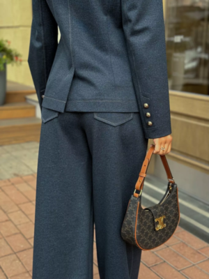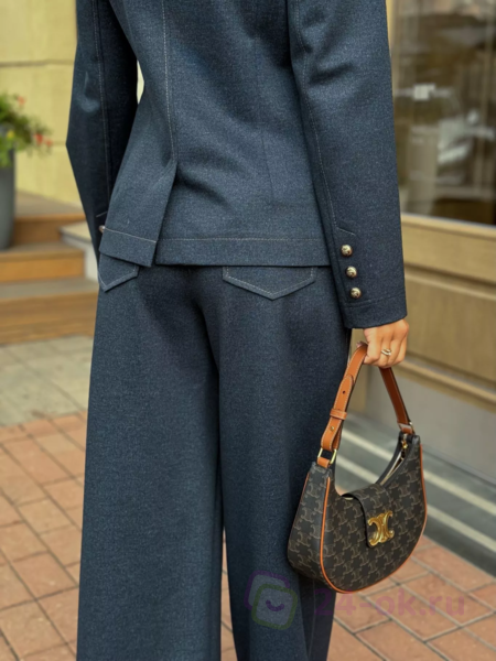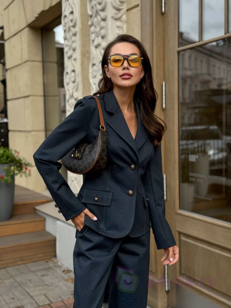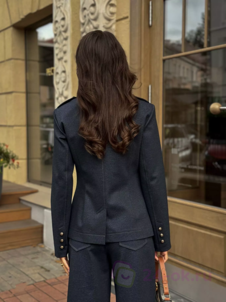 Жакет женский прилегающего силуэта, с центральной бортовой застежкой на петли и пуговицы. По переду обработаны рельефы, прорезные карманы с листочкой и клапаном, застегивающиеся на петлю и пуговицу. Спинка с рельефами и средним швом, в котором обработана шлица. Воротник с отрезной стойкой. Декоративные паты с пуговицей по плечевым швам. Рукав двухшовный, длинный с имитацией шлицы, которая декорирована пуговицами. Все отделочные строчки выполнены гарусной нитью контрастного цвета. Брюки женские, расширенные. По переду обработана застежка на молнию, обработаны карманы с наклонным входом. На задних половинках брюк застрочены вытачки, настрочены фигурные накладные карманы. Верх обработан широким притачным поясом (резинка по спинке) со шлевками, застегивающимся на кнопку. Декоративные элементы и фурнитура могут отличаться от заявленных на фото. Цвет материала может отличаться по тону в зависимости от настроек вашего монитора!