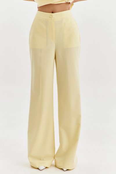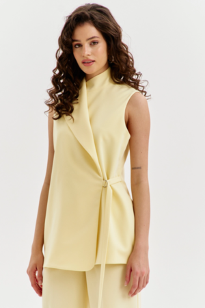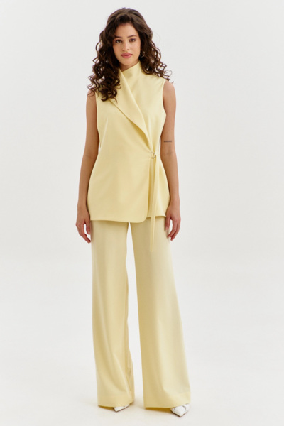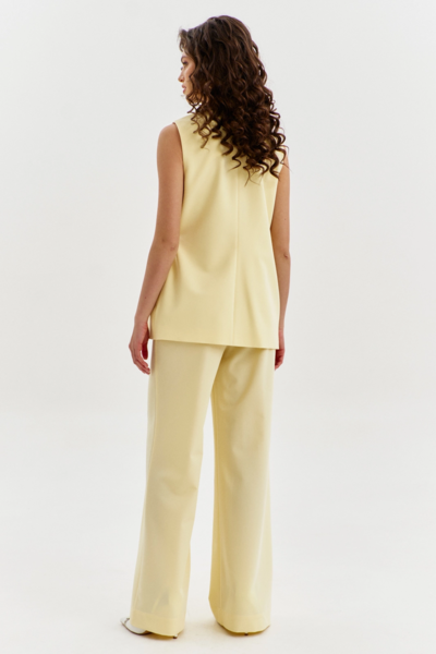 Жилет свободного кроя, длиной чуть ниже бедер. Спинка со средним швом. Перед ассиметричный: правый перед с воротником «апаш», левый перед с воротником стойка. Застежка двубортная на пояс с полукольцами. Жилет на подкладке. Брюки прямого силуэта, на притачном поясе с резинкой по спинке. По задним половинкам талиевые вытачки. По передним половинкам обработаны боковые карманы с наклонным входом, и застежка на тесьму-«молнию» с гульфиком и откоском. По поясу застежка на петлю и пуговицу.