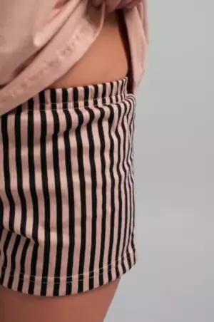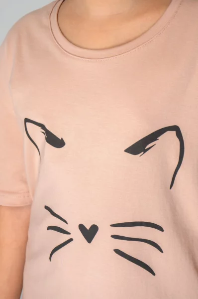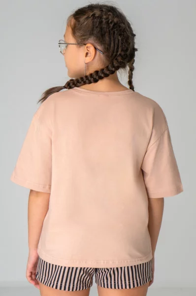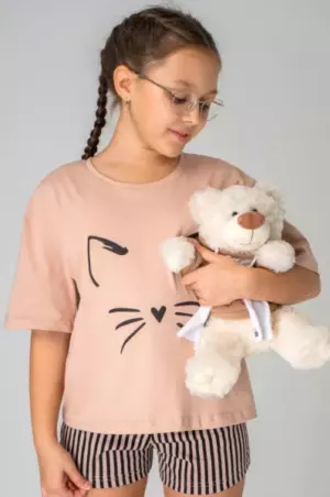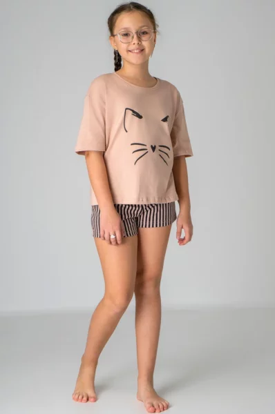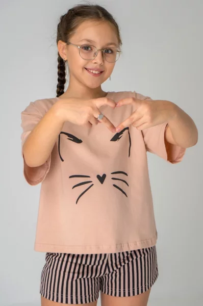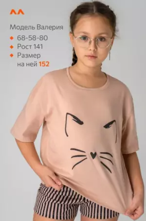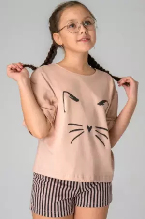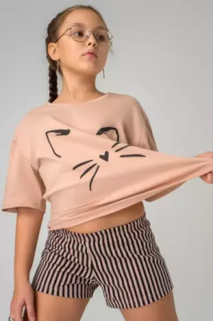 Комплект двойка включает в себя футболку оверсайз с милым принтом котик и короткие шорты в полоску прямого кроя на резинке. Удобный оверсайз не стесняет движений, а стильный дизайн придаёт образу игривость и свежесть. Шорты легко регулируются благодаря резинке, что обеспечивает отличную посадку.