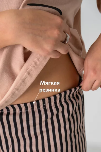 Бежевая пижама выполнена из трикотажной ткани кулирная гладь, состоящей на 100% из хлопка. Натуральная ткань дарит превосходную воздухопроницаемость и мягкость, что делает пижамку идеальным выбором для сна и отдыха. Хлопковый трикотаж нежно касается кожи и комфортен в любое время года.