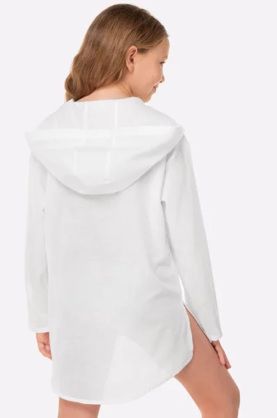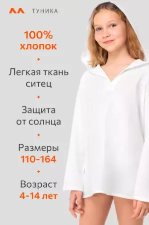 Пляжная рубашка с удлиненной спинкой избавит от необходимости использования дополнительной косметической защиты. Свободный крой, глубокий v-образный вырез горловины и разрезы по бокам позволяют легко надевать пляжную накидку. Летняя хлопковая туника для детей займет минимум места в поездке на пляж или пикник.