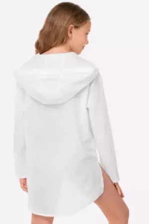 Море, солнце и песок! Детская пляжная эко-туника из ситца – настоящая находка для лета. Свободная туника с капюшоном полностью закрывает голову, плечи и спину ребенка. Ситцевая туника из натурального 100% хлопка выполнена в белом цвете, подходит для девочек, мальчиков и подростков.